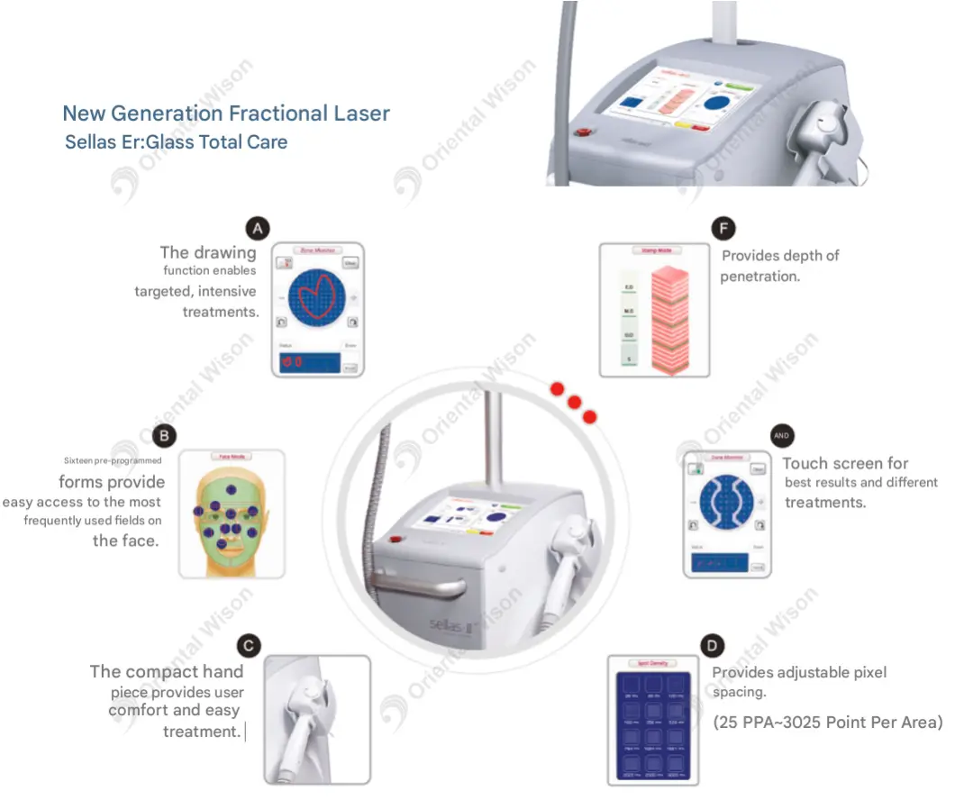 Es un sistema láser de vidrio Er: no invasivo con una longitud de onda de 1550 nm. La longitud de onda de 1550 nm aplica pulsos térmicos profundamente en la dermis a través de la epidermis, donde son absorbidos por el agua del tejido y provocan altas temperaturas en el interior del tejido. El tejido se calienta suavemente y provoca la descomposición de las células, mientras que la superficie de la piel no se daña.